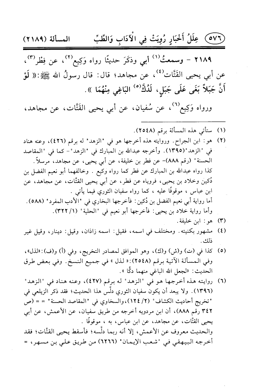 ٢١٨٩ - وسمعتُ (١) أَبِي وذكَرَ حَدِيثًا رَوَاهُ وَكِيع (٢) ، عَنْ فِطْر (٣) ، عَنْ أَبِي يَحْيَى القَتَّات (٤) ، عَنْ مُجَاهِدٍ؛ قَالَ: قال رسولُ الله (ص) : لَوْ أَنَّ جَبَلاً بَغَى عَلَى جَبَلٍ، لَدُكَّ (٥) البَاغِي مِنْهُمَا.