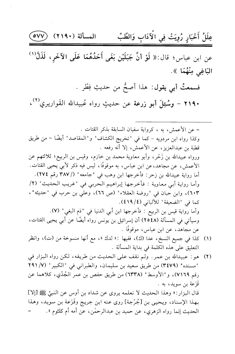 ٢١٩٠ - وسُئِلَ أَبُو زُرْعَةَ عَنْ حديثٍ رواه عُبيدالله القَواريري (٢) ،