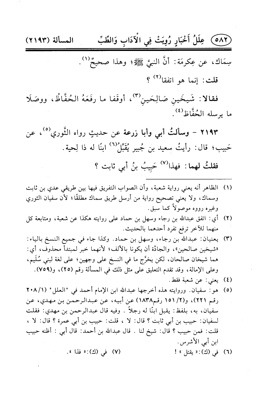 ٢١٩٣ - وسألتُ أَبِي وَأَبَا زُرْعَةَ عَن حديثٍ رَوَاهُ الثَّوري (٥) ، عَنْ حَبيب؛ قَالَ: رأيتُ سَعِيدَ ابن جُبير يُقَبِّلُ (٦) ابْنًا لَهُ ذَا لِحية.