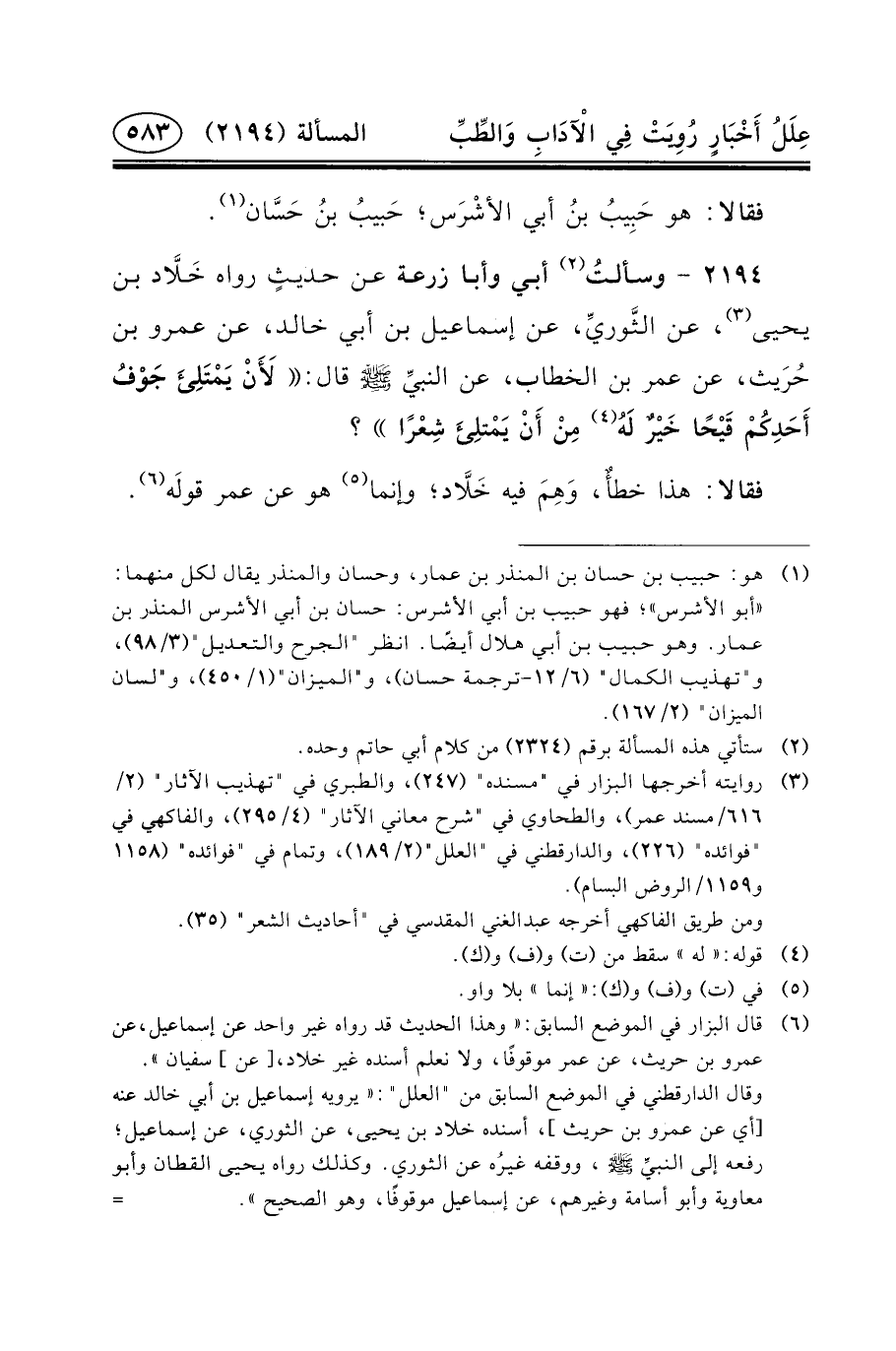 ٢١٩٤ - وسألتُ (٢) أَبِي وَأَبَا زُرْعَةَ عَنْ حديثٍ رَوَاهُ خَلَاّد بْنُ يَحْيَّى (٣) ، عَنِ الثَّوريِّ، عَنْ إِسْمَاعِيلَ بْنِ أَبِي خَالِدٍ، عَنْ عَمْرِو بْنِ حُرَيث، عَنْ عُمَرَ بْنِ الخطاب، عن النبيِّ (ص) قَالَ: لَأَنْ يَمْتَلِئَ جَوْفُ أَحَدِكُمْ قَيْحًا خَيْرٌ لَهُ (٤) مِنْ أَنْ يَمْتلِئَ شِعْرًا؟