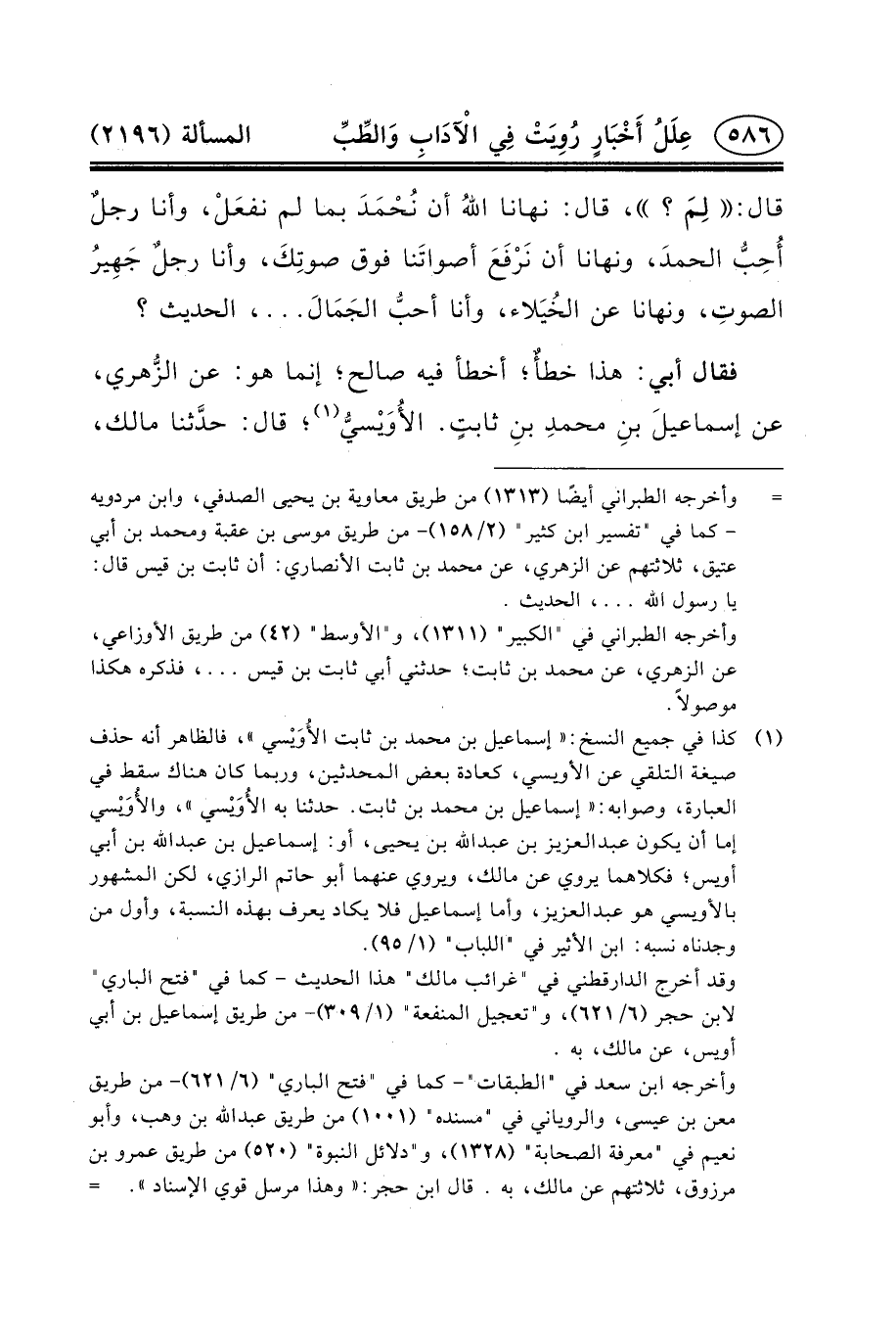 فَقَالَ أَبِي: هَذَا خطأٌ؛ أَخْطَأَ فِيهِ صَالِحٌ؛ إِنَّمَا هُوَ: عَنِ الزُّهري، عَنْ إسماعيلَ بنِ محمدِ ابنِ ثابتٍ. الأُوَيْسيُّ (١) ؛