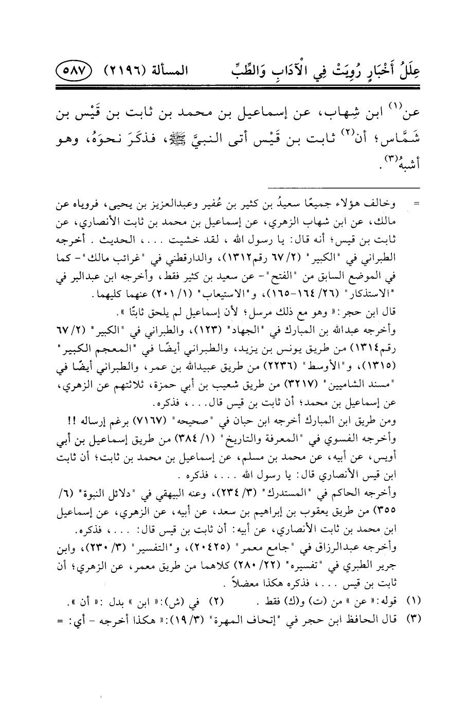 (٣) قال الحافظ ابن حجر في "إتحاف المهرة" (٣/١٩) : «هكذا أخرجه - أي: ابن حبان - بهذا السياق، وليس فيه ما يدل على أن إسماعيل سمعه من ثابت، فهو منقطع. ورواه مَالِكٌ فِي "الْمُوَطَّإِ" عَنِ ابْنِ شهاب، عن إسماعيل، عن ثابت أنه قال ... ، فذكره، ولم يذكره من رواة "الموطأ" إلا سعيد بن عُفير وحده، وقال: قال مالك: قتل ثابت بن قيس يوم اليمامة. قلت: فلم يدركه إسماعيل؛ فهو منقطع أيضًا» . اهـ.