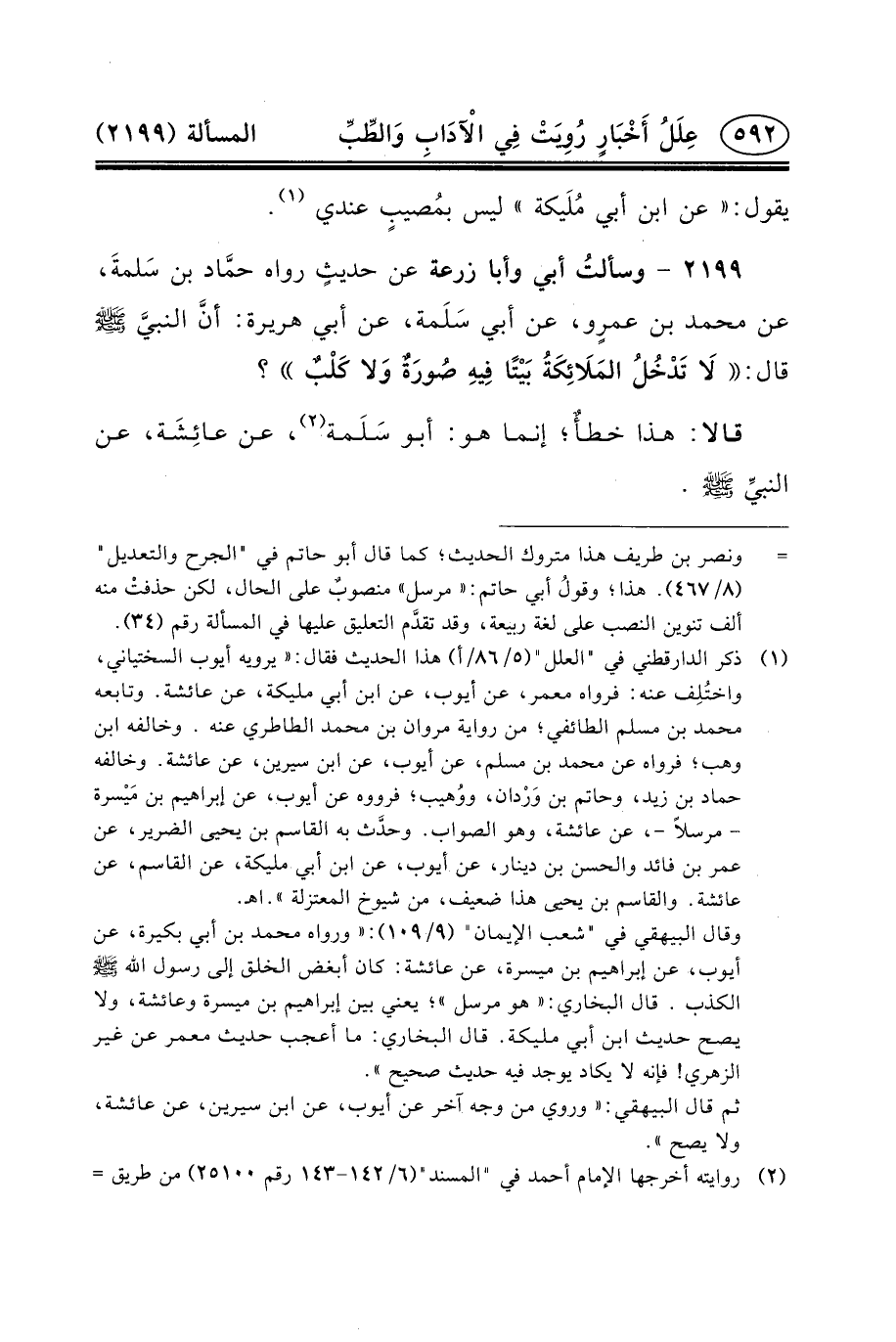 ٢١٩٩ - وسألتُ أَبِي وَأَبَا زُرْعَةَ عَنْ حديثٍ رَوَاهُ حمَّاد بْنُ سَلمةَ، عَنْ مُحَمَّدِ بْنِ عمرٍو، عَنْ أَبِي سَلَمة، عَنْ أَبِي هُرَيْرَةَ: أنَّ النبيَّ (ص) قَالَ: لَا تَدْخُلُ المَلَائِكَةُ بَيْتًا فِيهِ صُورَةٌ وَلا كَلْبٌ؟