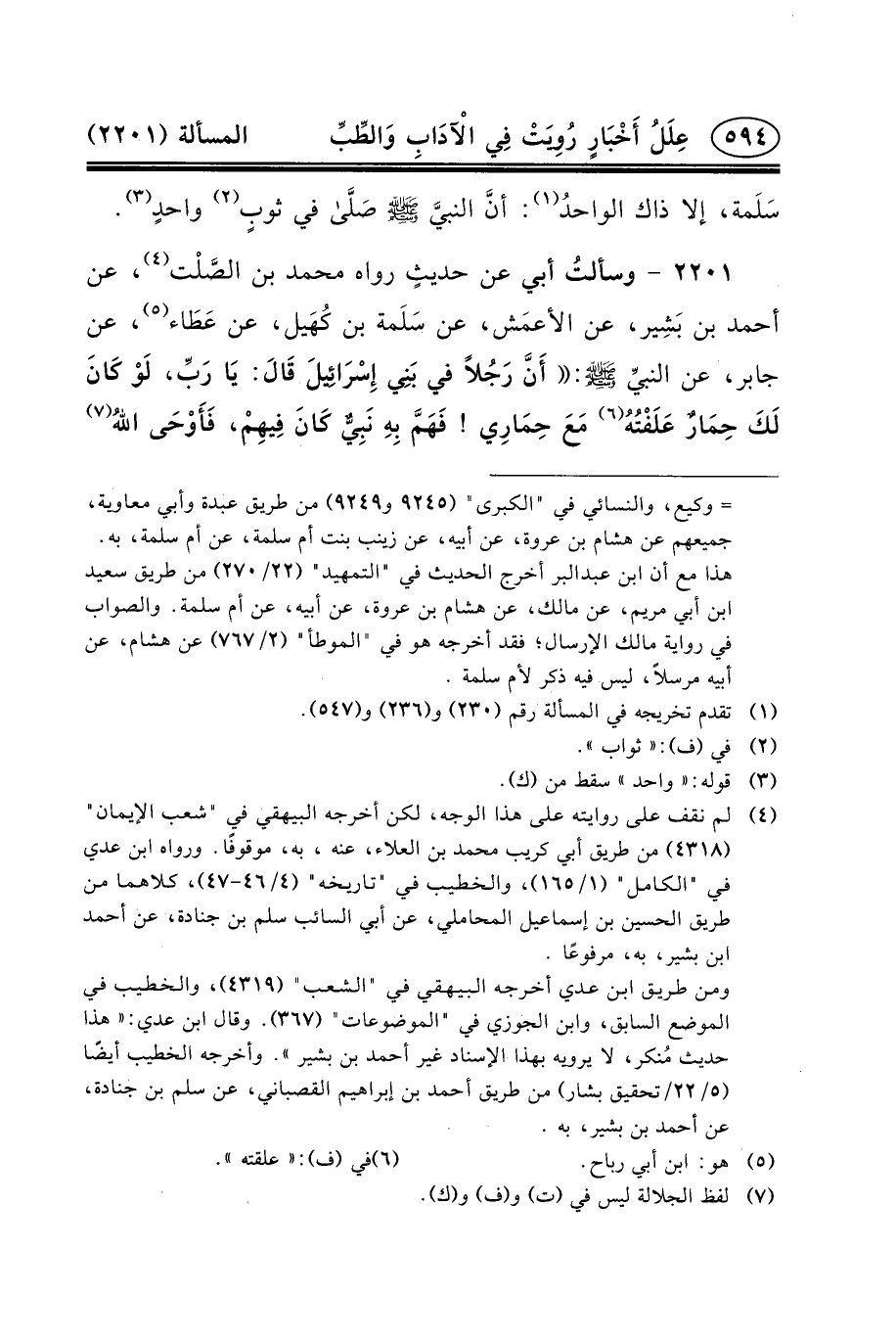 قَالَ أَبِي: هَذَا خطأٌ؛ اضْطَرَبَ فِيهِ حمَّاد؛ إِنَّمَا هُوَ: هِشَامٌ، عَنْ أَبِيهِ، عَنْ أُمِّ سَلَمة (٣) . وَلَيْسَ عَنْ هشام، عَنْ أَبِيهِ، عَنْ عُمَرَ بْنِ أَبِي سَلَمة، إِلا ذَاكَ الواحدُ (٤) : أنَّ النبيَّ (ص) صَلَّى فِي ثوبٍ (٥) واحدٍ (٦) .