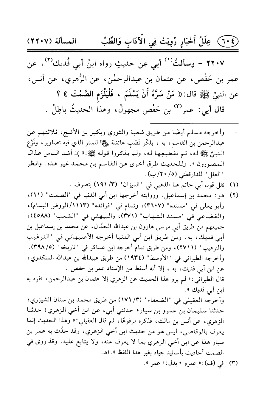 ٢٢٠٧ - وسألتُ (١) أَبِي عَنْ حديثٍ رَوَاهُ ابنُ أَبِي فُديك (٢) ، عَنْ عُمَرَ بْنِ حَفْص، عَنْ عُثْمَانَ بْنِ عبد الرحمن، عَنِ الزُّهري، عَنْ أَنَسٍ، عَنْ النبيِّ (ص) قَالَ: مَنْ سَرَّهُ أَنْ يَسْلَمَ، فَلْيَلْزَمِ الصَّمْتَ؟