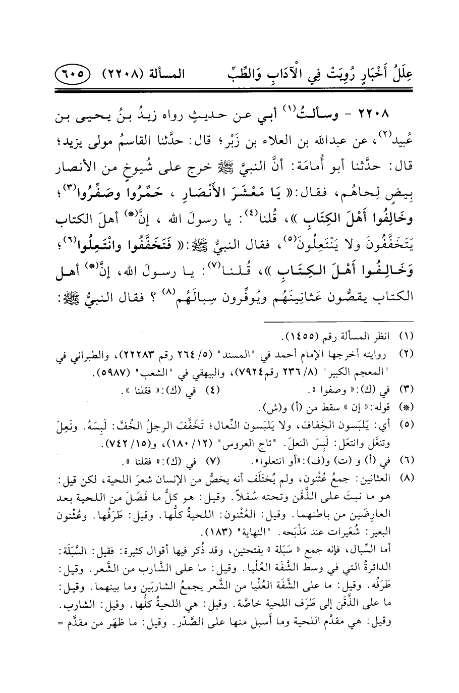 ٢٢٠٨ - وسألتُ (١) أَبِي عَنْ حديثٍ رَوَاهُ زيدُ بنُ يَحْيَى بْنِ عُبيد (٢) ، عن عبد الله بْنِ الْعَلاءِ بْنِ زَبْر؛ قَالَ: حدَّثنا القاسمُ مَوْلَى يَزِيدَ؛ قَالَ: حدَّثنا أَبُو أُمامَة: أنَّ النبيَّ (ص) خَرَجَ عَلَى شُيوخٍ مِنَ الأَنْصَارِ بِيضٍ لِحاهُم، فَقَالَ: يَا مَعْشَرَ الأَنْصَارِ، حَمِّرُوا وصَفِّرُوا (٣) ؛ وخَالِفُوا أَهْلَ الكِتَابِ، قُلنا (٤) : يَا رسولَ اللَّهِ، إنَّ (*) أهلَ الْكِتَابِ يَتَخَفَّفُونَ وَلا يَنْتَعِلُونَ (٥) ، فقال النبيُّ (ص) : فَتَخَفَّفُوا وانْتَعِلُوا (٦) ؛ وَخَالِفُوا أَهْلَ الكِتَابِ، قُلنا (٧) : يَا رسولَ اللَّهِ، إنَّ (*) أَهْلَ الْكِتَابِ يقصُّون عَثانِينَهُم ويُوفِّرون سِبالَهُم (٨) ؟