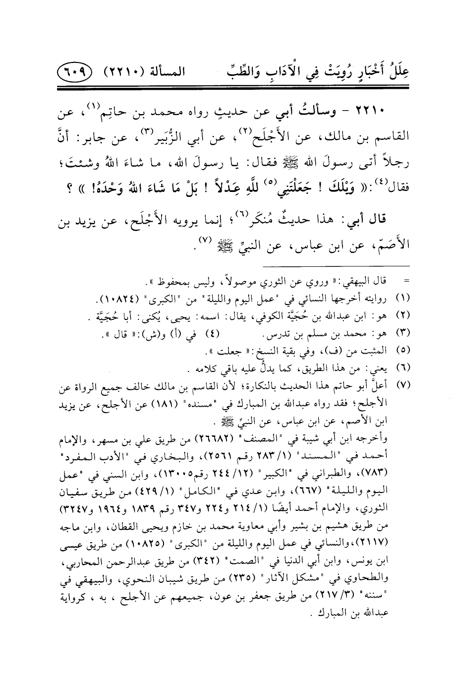 ٢٢١٠ - وسألتُ أَبِي عَنْ حديثٍ رَوَاهُ مُحَمَّدُ بْنُ حاتِم (١) ، عَنِ الْقَاسِمِ بْنِ مَالِكٍ، عَنِ الأَجْلَح (٢) ، عَنْ أَبِي الزُّبَير (٣) ، عَن جَابِر: أنَّ رجلاً أتى رسولَ الله (ص) فَقَالَ: يَا رسولَ اللَّهِ، مَا شاءَ اللهُ وشئتَ؛ فَقَالَ (٤) : وَيْلَكَ! جَعَلْتَنِي (٥) للَّهِ عَِدْلاً! بَلْ مَا شَاءَ اللهُ وَحْدَهُ! ؟