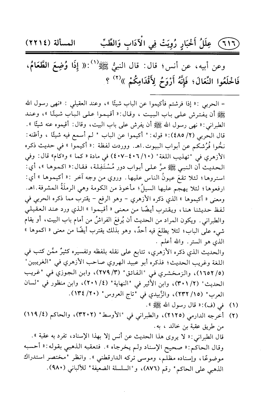 وَعَنْ أَبِيهِ، عَنْ أَنَسٍ؛ قَالَ: قال النبيُّ (ص) (١) : إِذَا وُضِعَ الطَّعَامُ، فَاخْلَعُوا النِّعَالَ؛ فَإِنَّهُ أَرْوَحُ لأَِقْدَامِكُمْ (٢) ؟