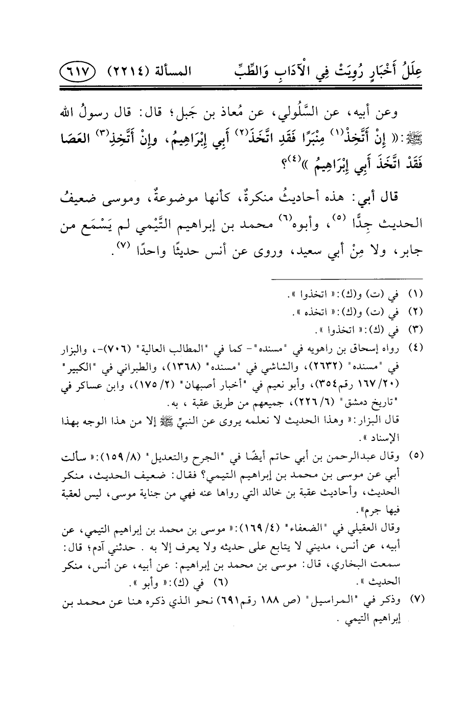 وَعَنْ أَبِيهِ، عَنِ السَّلُولي، عَنْ مُعاذ بْنِ جَبل؛ قَالَ: قَالَ رسولُ الله (ص) : إِنْ أَتَّخِذْ (١) مِنْبَرًا فَقَدِ اتَّخَذَ (٢) أَبِي إِبْرَاهِيمُ، وإِنْ أَتَّخِذِ (٣) العَصَا فَقَدْ اتَّخَذَ أَبِي إِبْرَاهِيمُ (٤) ؟