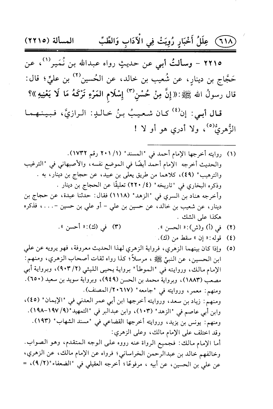 ٢٢١٥ - وسألتُ أَبِي عَنْ حديثٍ رَوَاهُ عبد الله بْنُ نُمَير (١) ، عَنْ حَجَّاج بْنِ دينارٍ، عَنْ شُعيب بْنِ خَالِدٍ، عَنِ الحُسين (٢) بْنِ عليٍّ؛ قَالَ: قال رسولُ الله (ص) : إِنَّ مِنْ حُسْنِ (٣) إِسْلَامِ المَرْءِ تَرْكَهُ مَا لَا يَعْنِيهِ؟