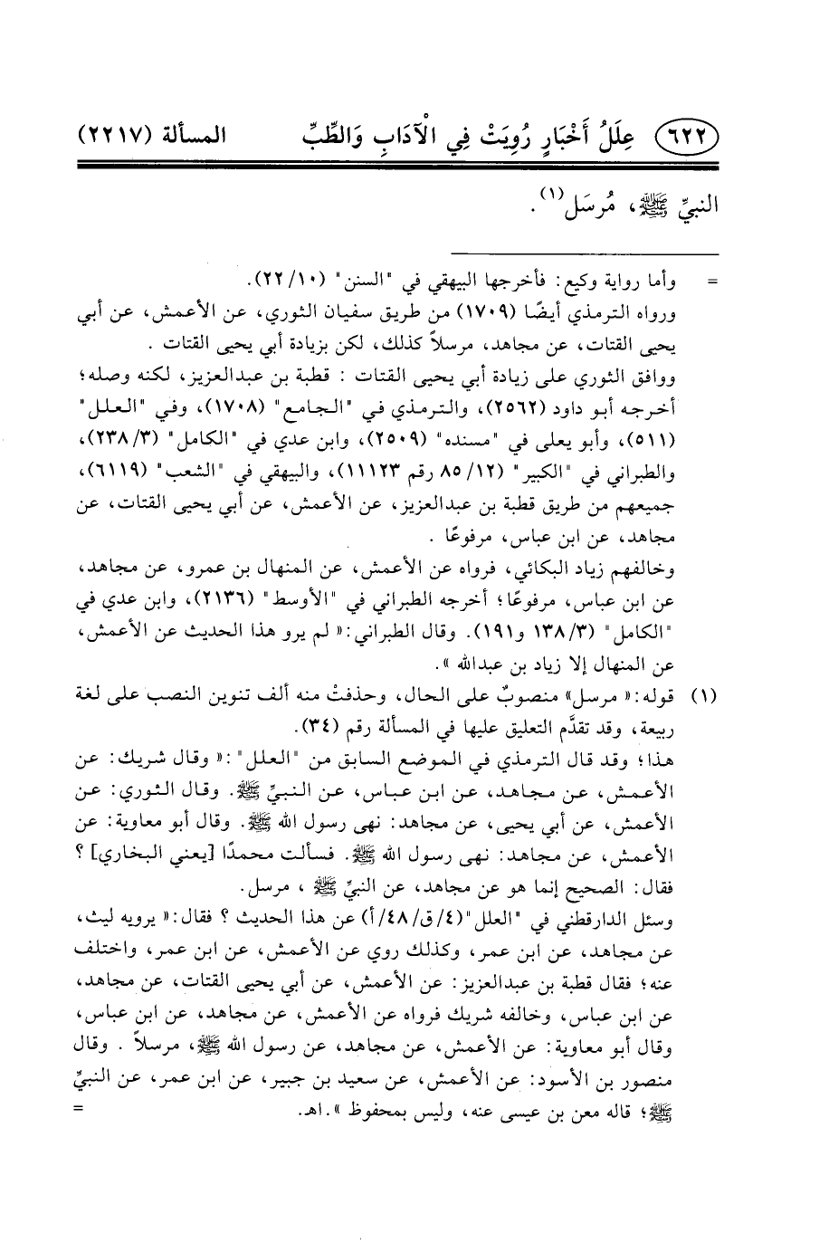 هذا؛ وقد قال الترمذي في الموضع السابق من "العلل": «وقال شَرِيكٍ: عَنِ الأَعْمَشِ، عَنْ مُجَاهِدٍ، عَنِ ابْنِ عَبَّاس، عَنِ النبيِّ (ص) . وقال الثَّوْرِيِّ: عَنِ الأَعْمَشِ، عَنْ أَبِي يحيى، عن مجاهد: نهى رسول الله (ص) . وقال أَبُو مُعَاوِيَةَ: عَنِ الأَعْمَشِ، عَنْ مجاهد: نهى رسول الله (ص) . فسألت محمدًا [يعني البخاري] ؟ فقال: الصحيح إنما هو عن مجاهد، عن النبيِّ (ص) ، مرسل.