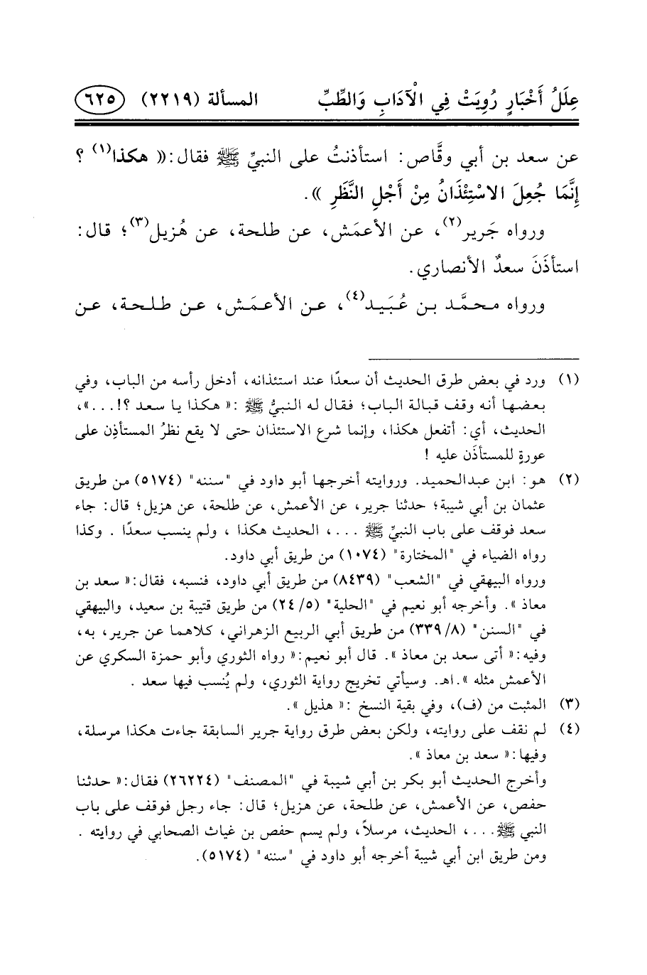 (١) ورد في بعض طرق الحديث أن سعدًا عند استئذانه، أدخل رأسه من الباب، وفي بعضها أنه وقف قبالة الباب؛ فقال له النبيُّ (ص) : «هكذا يا سعد؟! ... » ، الحديث، أي: أتفعل هكذا، وإنما شرع الاستئذان حتى لا يقع نظرُ المستأذِن على عورةٍ للمستأذَن عليه!