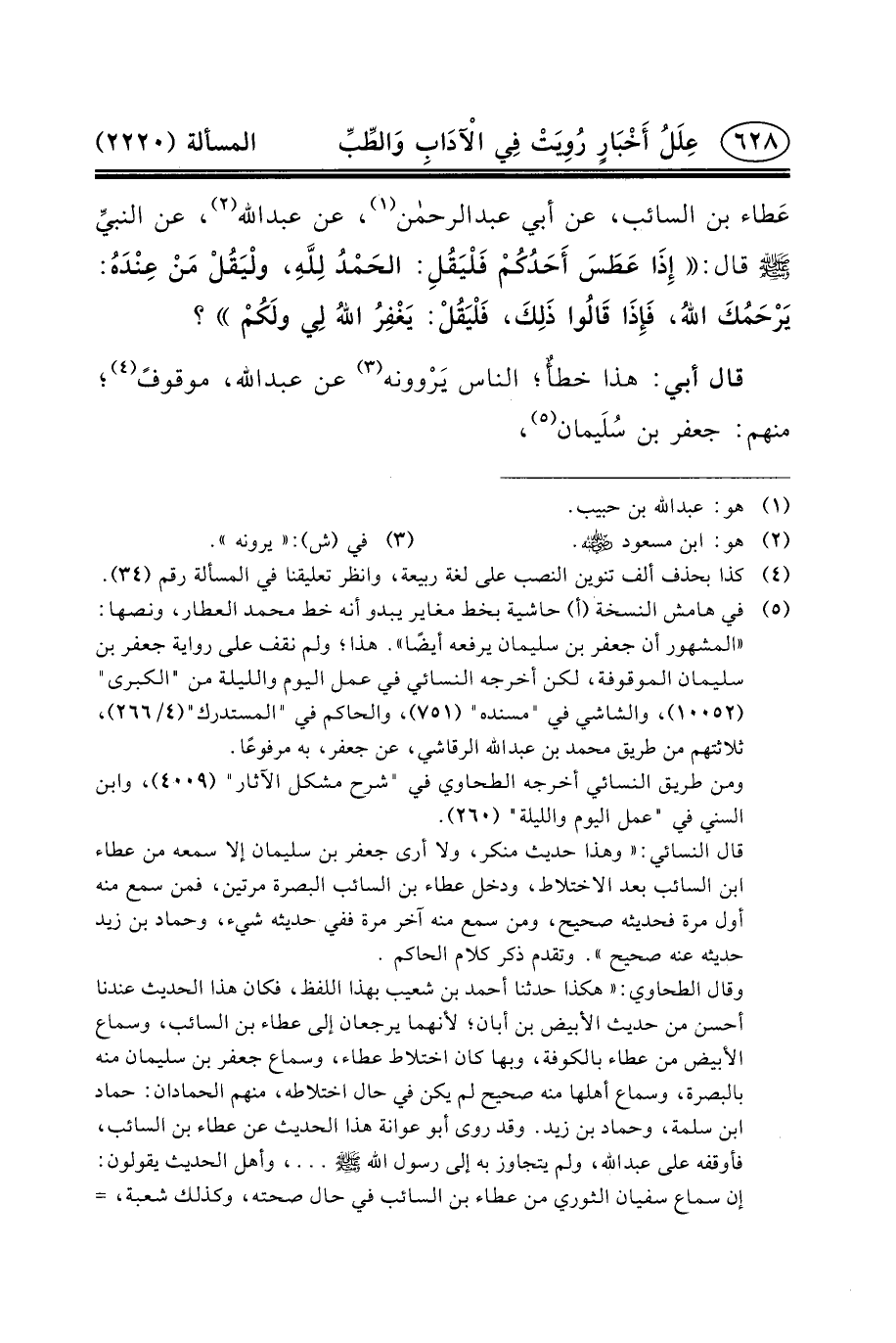 عَطاء بْنِ السَّائِبِ، عَنْ أَبِي عبد الرحمن (١) ، عن عبد الله (٢) ، عن النبيِّ (ص) قَالَ: إِذَا عَطَسَ أَحَدُكُمْ فَلْيَقُلِ: الحَمْدُ لِلَّهِ، ولْيَقُلْ مَنْ عِنْدَهُ: يَرْحَمُكَ اللهُ، فَإِذَا قَالُوا ذَلِكَ، فَلْيَقُلْ: يَغْفِرُ اللهُ لِي ولَكُمْ؟