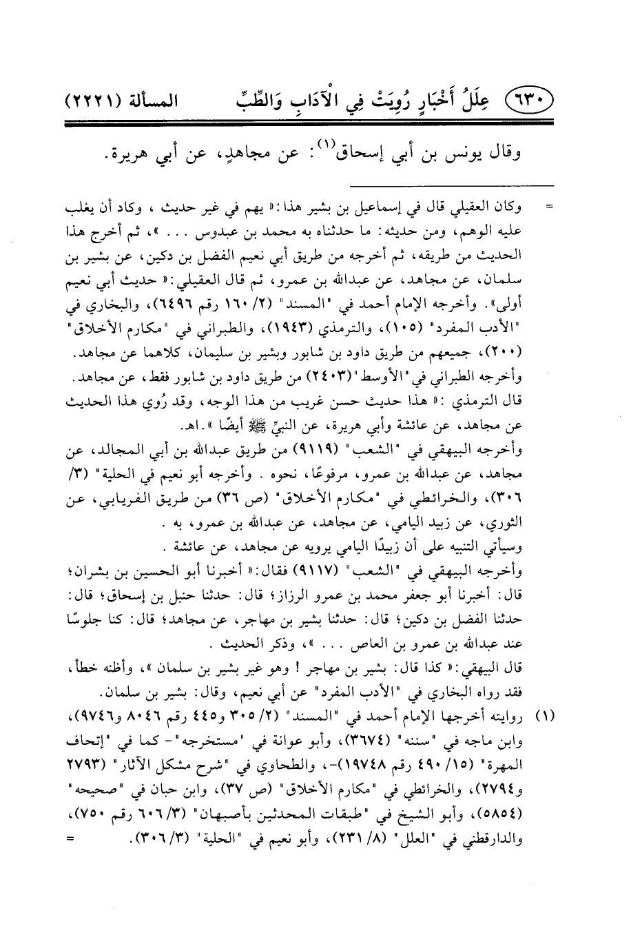 (١) روايته أخرجها الإمام أحمد في "المسند" (٢/٣٠٥ و٤٤٥ رقم ٨٠٤٦ و٩٧٤٦) ، وابن ماجه في "سننه" (٣٦٧٤) ، وأبو عوانة في "مستخرجه"- كما في "إتحاف المهرة" (١٥/٤٩٠ رقم ١٩٧٤٨) -، والطحاوي في "شرح مشكل الآثار" (٢٧٩٣ و٢٧٩٤) ، والخرائطي في "مكارم الأخلاق" (ص ٣٧) ، وابن حبان في "صحيحه" (٥٨٥٤) ، وأبو الشيخ في "طبقات المحدثين بأصبهان" (٣/٦٠٦ رقم ٧٥٠) ، والدارقطني في "العلل" (٨/٢٣١) ، وأبو نعيم في "الحلية" (٣/٣٠٦) .