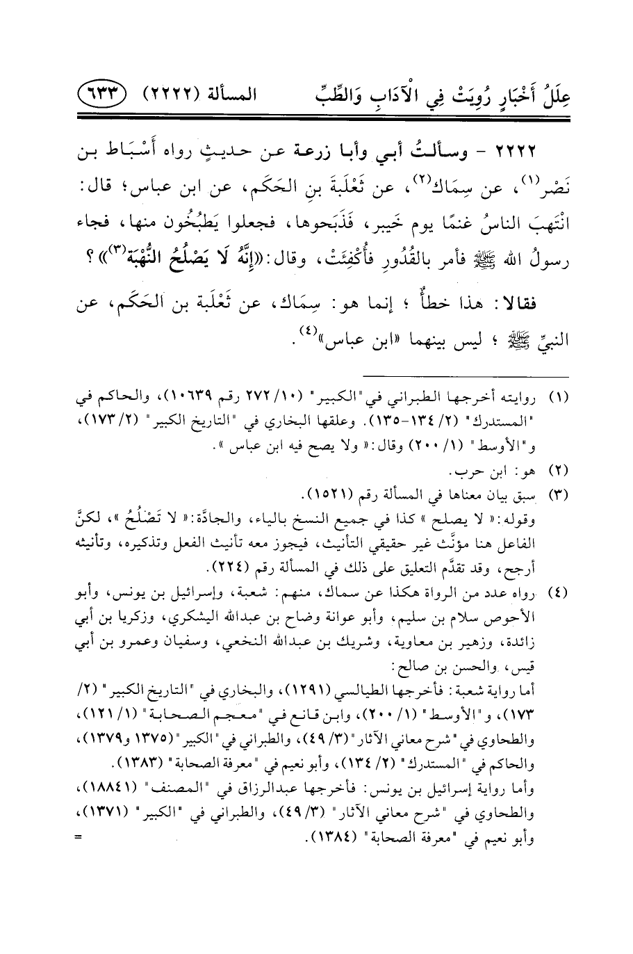 ٢٢٢٢ - وسألتُ أَبِي وَأَبَا زُرْعَةَ عَنْ حديثٍ رَوَاهُ أَسْبَاط بْنُ نَصْر (١) ، عَنْ سِمَاك (٢) ، عَنْ ثَعْلَبةَ بنِ الحَكَم، عَنِ ابْنِ عَبَّاسٍ؛ قَالَ: انْتَهبَ الناسُ غَنَمًا يَوْمَ خَيبر، فَذَبَحوها، فَجَعَلُوا يَطبُخُون مِنْهَا، فَجَاءَ رسولُ الله (ص) فَأَمَرَ بالقُدُورِ فأُكْفِئَتْ، وَقَالَ: إِنَّهُ لَا يَصْلُحُ النُّهْبَة (٣) ؟