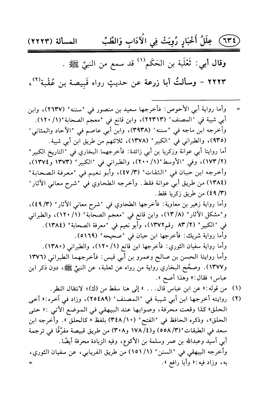 ٢٢٢٣ - وسألتُ أَبَا زُرْعَةَ عَنْ حديثٍ رواه قَبِيصة بن عُقْبة (٢) ،