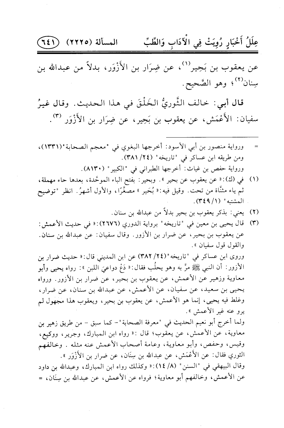 قَالَ أَبِي: خالف الثَّوريُّ الخَلْقَ فِي هذا الحديث. وقال غيرُ سفيان: الأَعْمَش، عَنْ يَعْقُوبَ بْنِ بَحِير، عن ضِرَار بن الأَزْوَر (٣) .