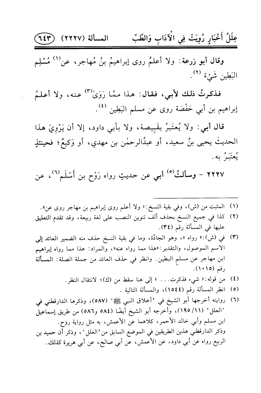 ٢٢٢٧ - وسألتُ (٥) أَبِي عَنْ حديثٍ رَوَاهُ رَوْح بْنُ أَسْلَم (٦) ، عن