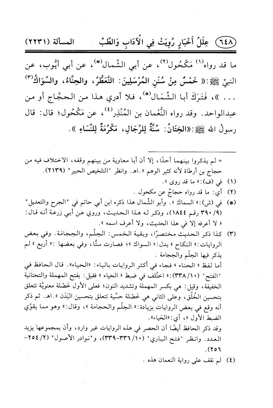 مَا قَدْ رَوَاهُ (١) مَكْحُول (٢) ، عَنْ أَبِي الشِّمال (*) ، عَنْ أَبِي أيُّوب، عن النبيِّ (ص) : خَمْسٌ مِنْ سُنَنِ المُرْسَلِينَ: التَّعَطُّرُ، والحِنَّاءُ، والسِّوَاكُ (٣) ... ، فَتَرَكَ أَبَا الشِّمَال (*) ، فَلا أَدْرِي هَذَا مِنَ الحجَّاج أو من عبد الواحد. وَقَدْ رَوَاهُ النُّعْمان بْنُ المُنْذِر (٤) ، عَنْ مَكْحُول؛ قَالَ: قَالَ رسولُ الله (ص) : الخِتَانُ: سُنَّةٌ لِلرِّجَالِ، مَكْرُمَةٌ لِلنِّسَاءِ.