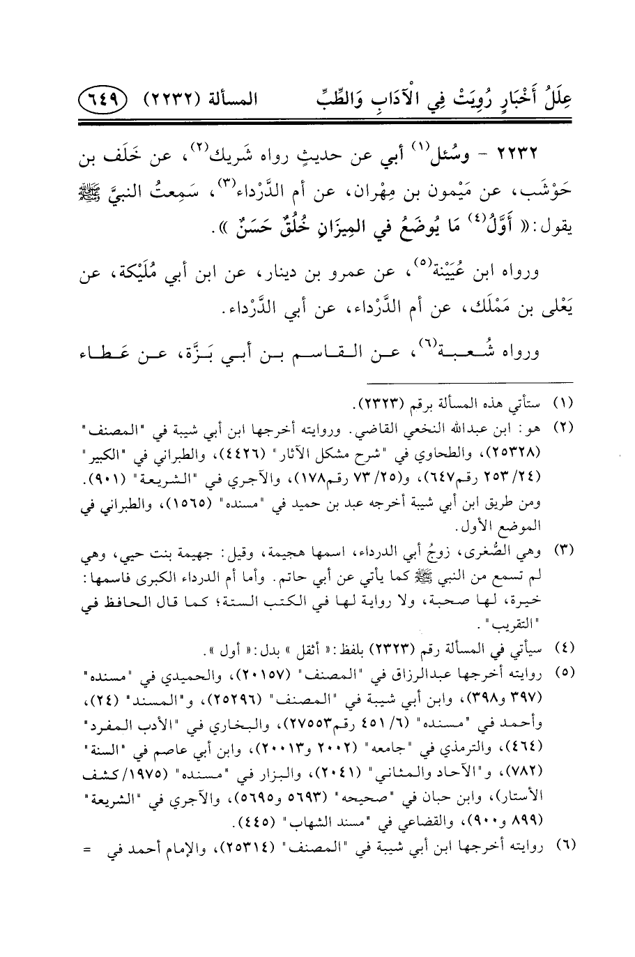 ٢٢٣٢ - وسُئل (١) أَبِي عَنْ حديثٍ رَوَاهُ شَريك (٢) ، عَنْ خَلَف بْنِ حَوْشَب، عن مَيْمون ابن مِهْران، عَنْ أُمِّ الدَّرْداء (٣) ، سَمِعتُ النبيَّ (ص) يَقُولُ: أَوَّلُ (٤) مَا يُوضَعُ فِي المِيزَانِ خُلُقٌ حَسَنٌ.