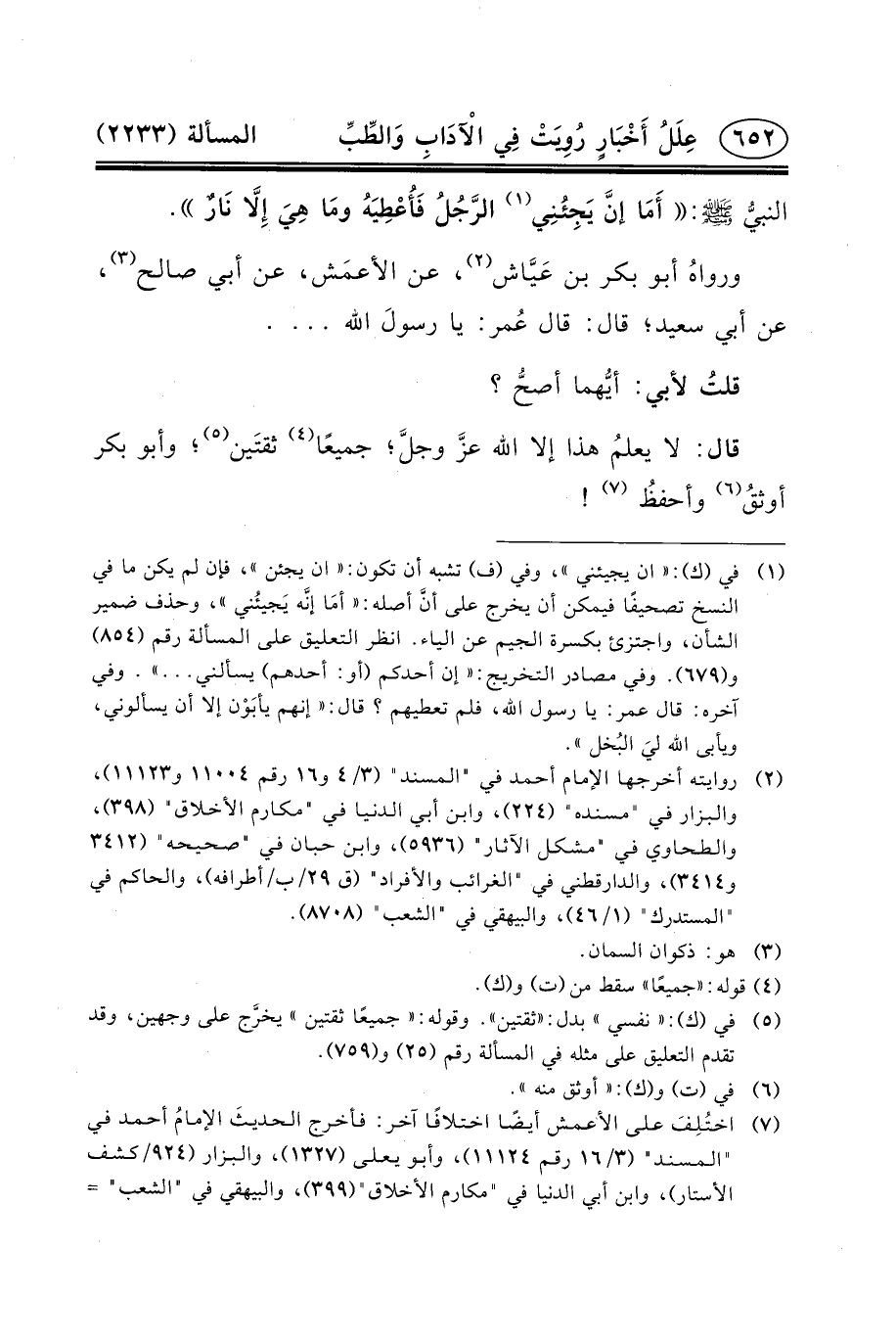 (١) في (ك) : «ان يجيئني» ، وفي (ف) تشبه أن تكون: «ان يجئن» ، فإن لم يكن ما في النسخ تصحيفًا فيمكن أن يخرج على أنَّ أصله: «أمَا إنَّه يَجيئُني» ، وحذف ضمير الشأن، واجتزئ بكسرة الجيم عن الياء. انظر التعليق على المسألة رقم (٨٥٤) و (٦٧٩) . وفي مصادر التخريج: «إن أحدكم (أو: أحدهم) يسألني ... » . وفي آخره: قَالَ عُمَرُ: يَا رَسُولَ اللَّهِ، فلم تعطيهم؟ قال: «إنهم يأبَوْن إلا أن يسألوني، ويأبى الله ليَ البُخل» .