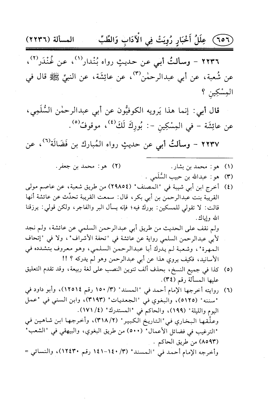 ٢٢٣٦ - وسألتُ أَبِي عَنْ حديثٍ رَوَاهُ بُنْدار (١) ، عَنْ غُنْدَر (٢) ، عَنْ شُعبة، عن أبي عبد الرحمن (٣) ، عن عائِشَة، عن النبيِّ (ص) قَالَ فِي المِسْكِينِ؟