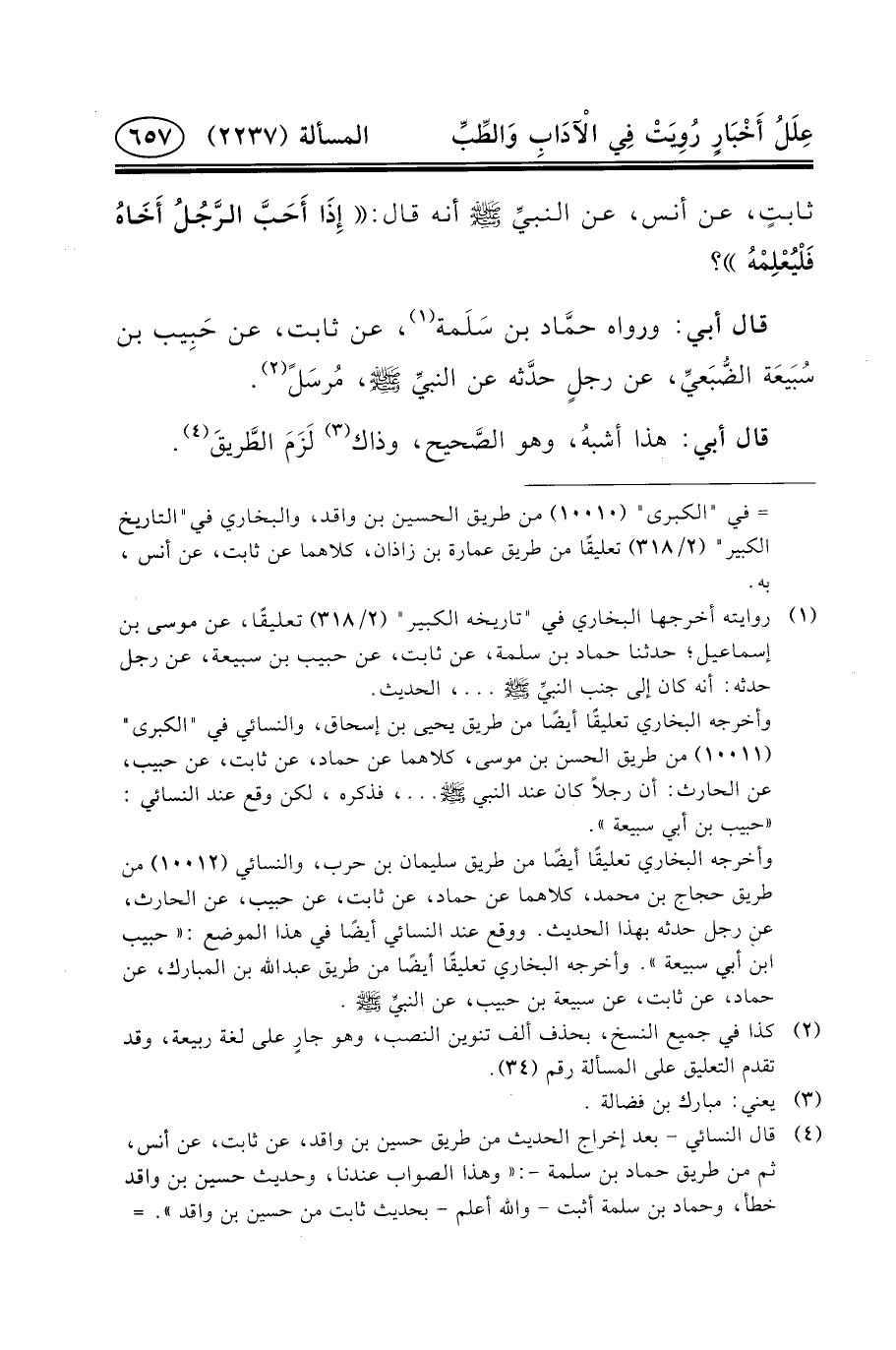 وأخرجه البخاري تعليقًا أيضًا من طريق يحيى بن إسحاق، والنسائي في "الكبرى" (١٠٠١١) من طريق الحسن بن موسى، كلاهما عَنْ حَمَّادٍ، عَنْ ثَابِتٍ، عَنْ حبيب، عن الحارث: أن رجلاً كان عند النبي (ص) ... ، فذكره، لكن وقع عند النسائي: «حبيب بن أبي سبيعة» .