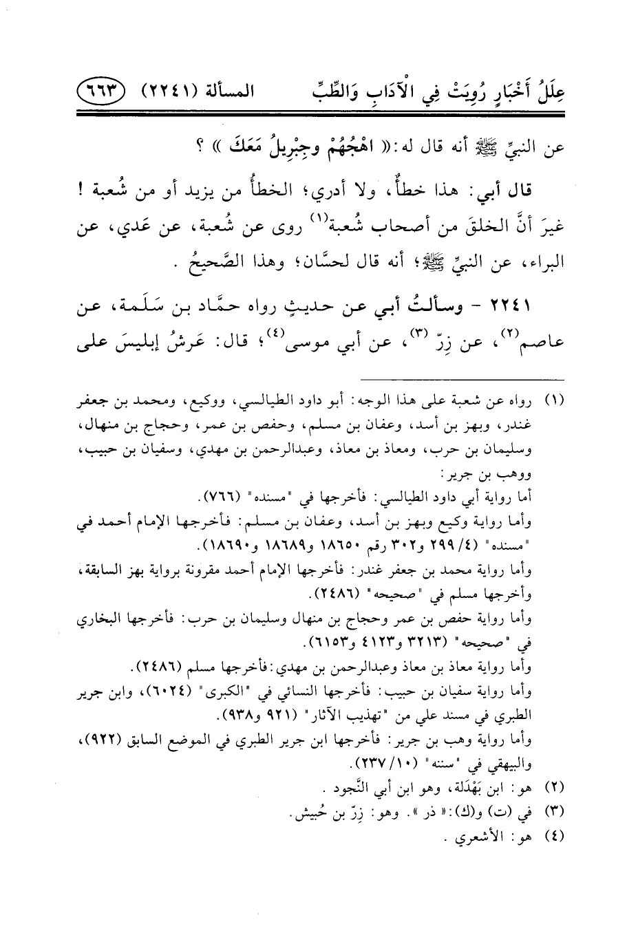 ٢٢٤١ - وسألتُ أَبِي عَنْ حديثٍ رَوَاهُ حمَّاد بْنُ سَلَمة، عَنْ عَاصِمٍ (٢) ، عَنْ زِرّ (٣) ، عَنْ أَبِي مُوسَى (٤) ؛ قال: عَرشُ إبليسَ على