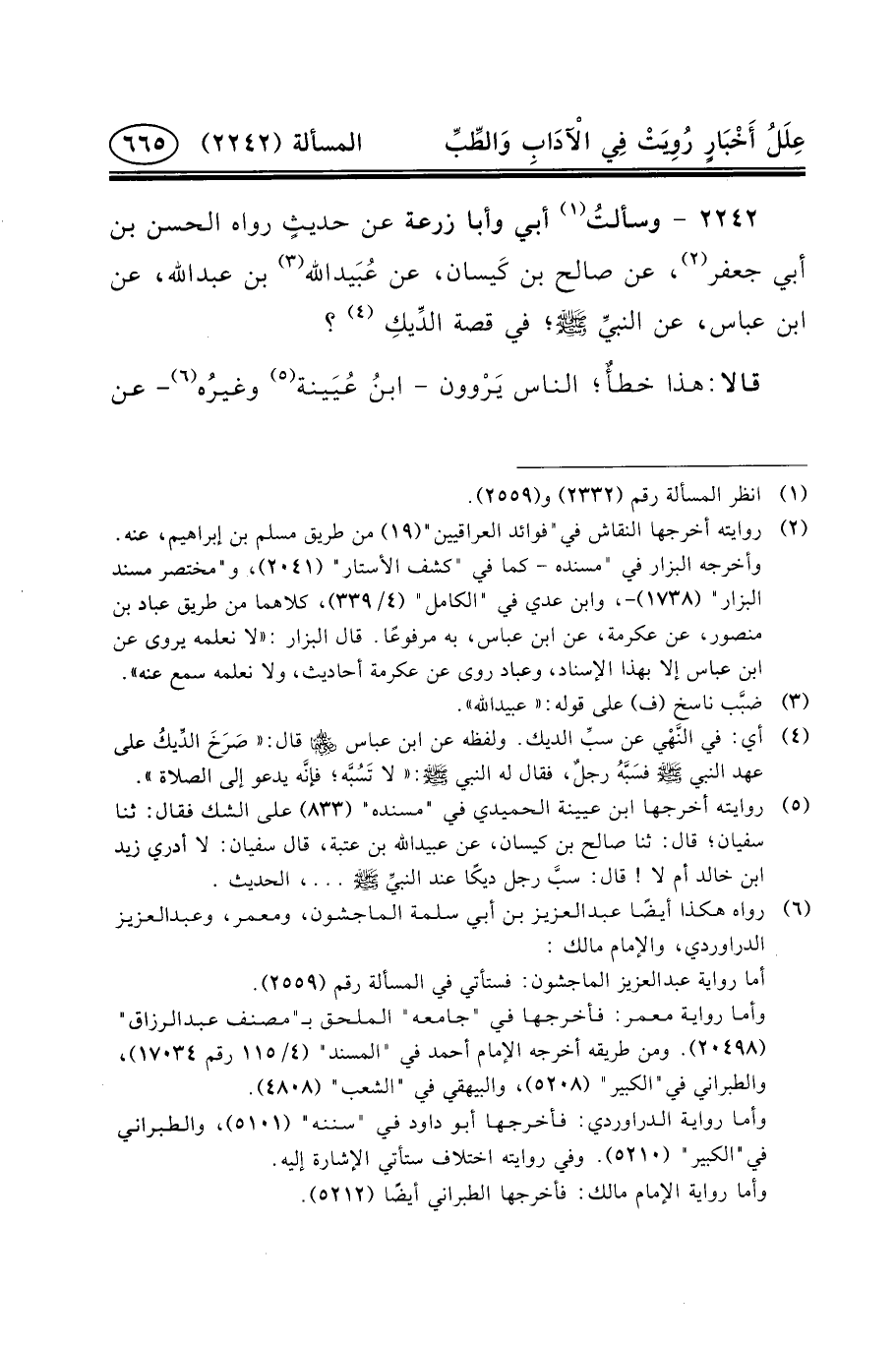 ٢٢٤٢ - وسألتُ (١) أَبِي وَأَبَا زُرْعَةَ عَنْ حديثٍ رَوَاهُ الْحَسَنُ بْنُ أَبِي جَعْفَرٍ (٢) ، عَنْ صَالِحِ بْنِ كَيسان، عن عُبَيدالله (٣) بن عبد الله، عَنِ ابْنِ عَبَّاس، عَنِ النبيِّ (ص) ؛ فِي قِصَّةِ الدِّيكِ (٤) ؟