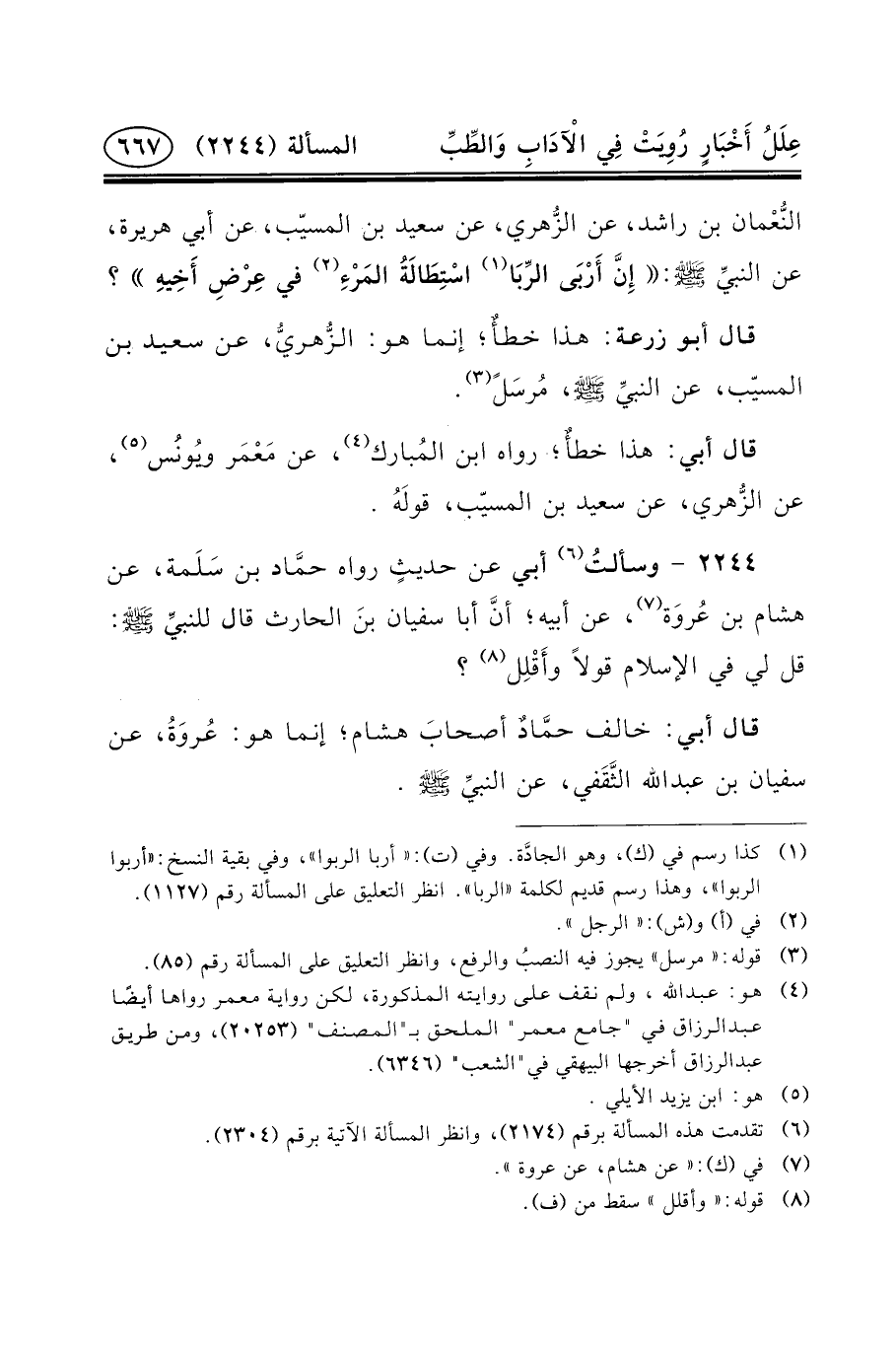 ٢٢٤٤ - وسألتُ (٦) أَبِي عَنْ حديثٍ رَوَاهُ حمَّاد بْنُ سَلَمة، عَنْ هِشَامِ بْنِ عُروَة (٧) ، عَنْ أَبِيهِ؛ أنَّ أَبَا سُفْيَانَ بنَ الحارث قال للنبيِّ (ص) : قْلُ لِي فِي الإِسْلامِ قَوْلا وأَقْلِل (٨) ؟