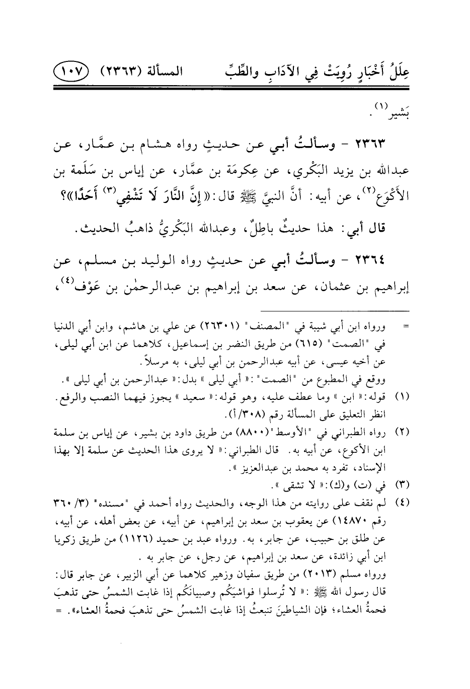 ٢٣٦٣ - وسألتُ أَبِي عَنْ حديثٍ رَوَاهُ هِشَامُ بْنُ عمَّار، عَنِ عبد الله بْنِ يَزِيدَ البَكْري، عَنْ عِكرمَة بْنِ عمَّار، عَنْ إِيَّاسِ بْنِ سَلَمة بْنِ الأَكْوَع (٢) ، عَنْ أَبِيهِ: أنَّ النبيَّ (ص) قَالَ: إِنَّ النَّارَ لَا تَشْفِي (٣) أَحَدًا؟