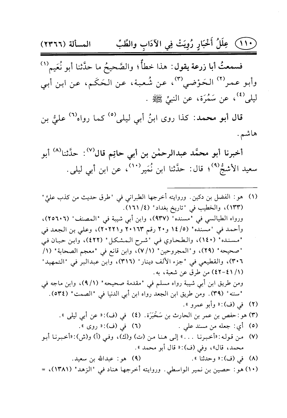أَخْبَرَنَا أَبُو محمَّد عبد الرحمن بْنُ أَبِي حاتِم قَالَ (٧) : حدَّثنا (٨) أَبُو سَعِيد الأشجُّ (٩) ؛ قَالَ: حدَّثنا ابْن نُمَير (١٠) ، عَنِ ابْن أَبِي ليلى.