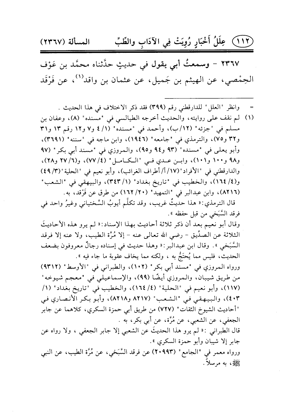 ٢٣٦٧ - وسمعتُ أَبِي يَقُولُ فِي حديثٍ حدَّثناه محمَّد بْنُ عَوْف الحِمْصي، عن الهيثم ابن جَميل، عَنْ عُثْمَانَ بْنِ وَاقِدٍ (١) ،