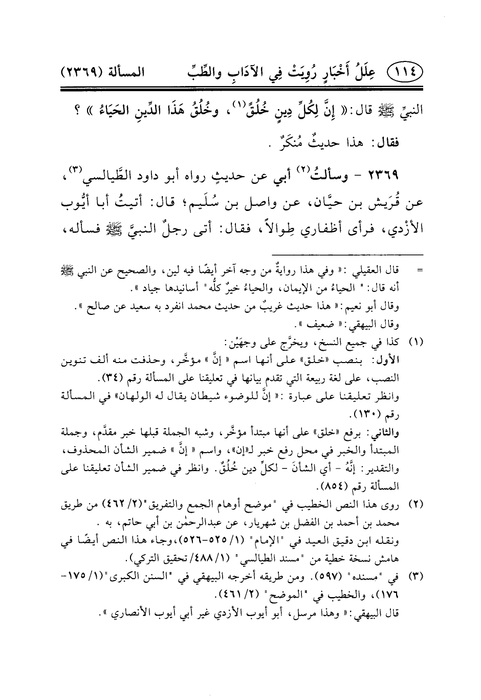 ٢٣٦٩ - وسألتُ (٢) أَبِي عَنْ حديثٍ رَوَاهُ أَبُو دَاوُدَ الطَّيالسي (٣) ، عَنْ قُرَيش بْنِ حيَّان، عَنْ وَاصِلِ بْنِ سُلَيم؛ قَالَ: أتيتُ أَبَا أيُّوب الأزْدي، فَرَأَى أَظْفَارِي طِوالاً، فَقَالَ: أَتَى رجلٌ النبيَّ (ص) فسأله،