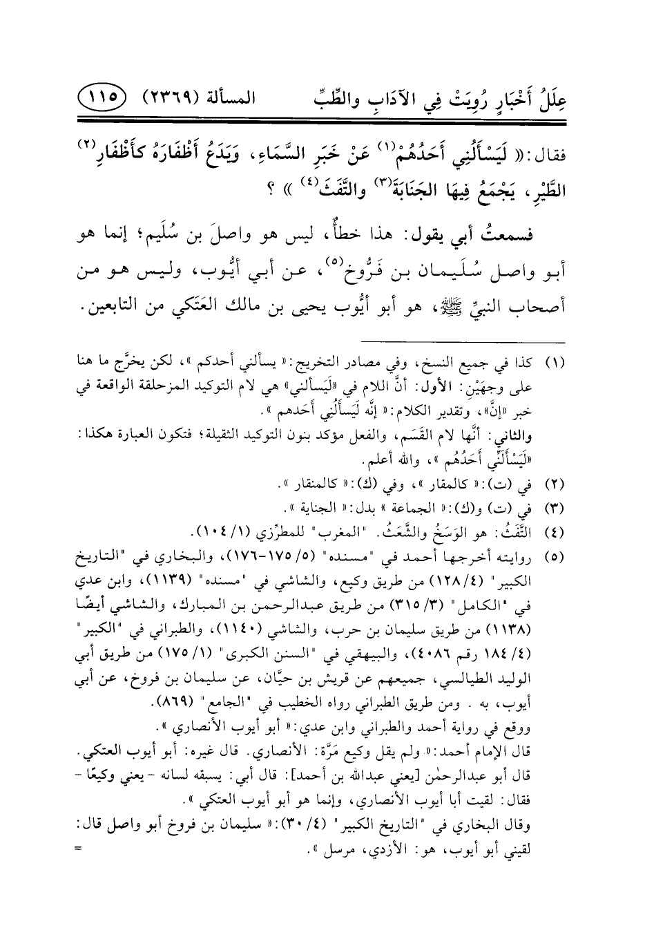 فسمعتُ أَبِي يَقُولُ: هَذَا خطأٌ، لَيْسَ هُوَ واصلَ بْنُ سُلَيم؛ إِنَّمَا هُوَ أَبُو واصل سُلَيمان ابن فَرُّوخ (٥) ، عَنْ أَبِي أيُّوب، وَلَيْسَ هو من أصحاب النبيِّ (ص) ، هُوَ أَبُو أيُّوب يَحْيَى بْنُ مالك العَتَكي من التابعين.
