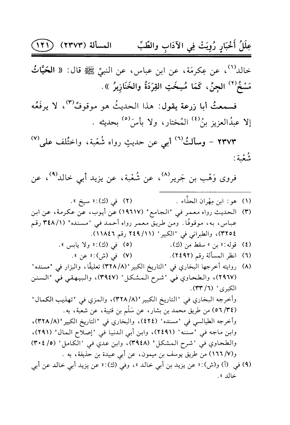 خَالِدٌ (١) ، عَنْ عِكرمَة، عَنِ ابْنِ عباس، عن النبيِّ (ص) قَالَ: الحَيَّاتُ مَسْخُ (٢) الجِنِّ، كَمَا مُسِخَتِ القِرَدَةُ والخَنَازِيرُ.