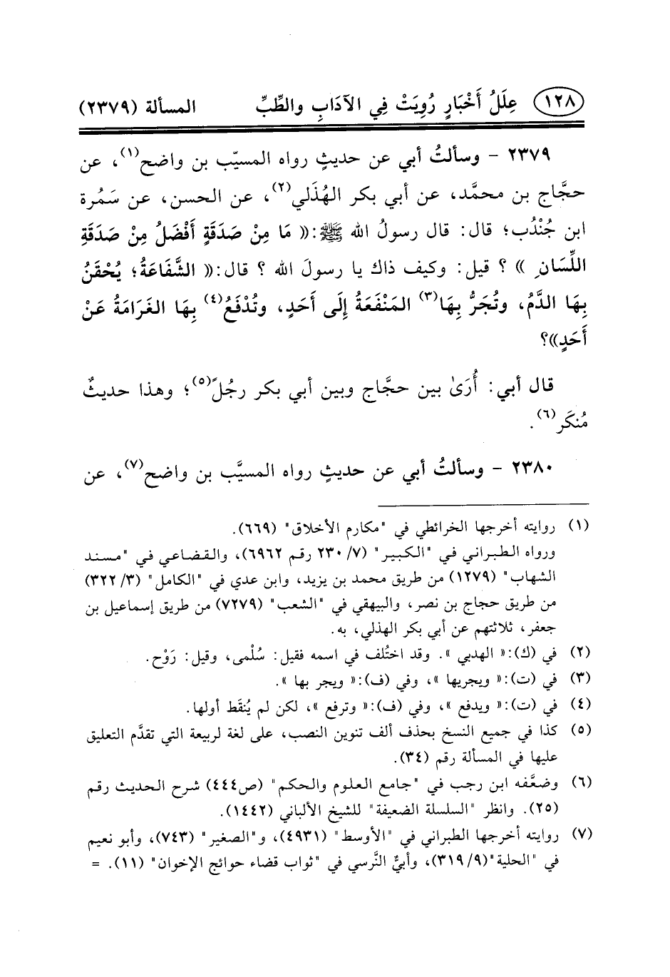 ٢٣٧٩ - وسألتُ أَبِي عَنْ حديثٍ رَوَاهُ الْمُسَيِّبُ بْنُ وَاضِحٍ (١) ، عَنْ حجَّاج بْنِ محمَّد، عَنْ أَبِي بَكْرٍ الهُذَلي (٢) ، عَنِ الْحَسَنِ، عَنْ سَمُرة ابن جُنْدُب؛ قَالَ: قَالَ رسولُ اللَّهِ (ص) : مَا مِنْ صَدَقَةٍ أَفْضَلُ مِنْ صَدَقَةِ اللِّسَان ِ؟ قِيلَ: وَكَيْفَ ذَاكَ يَا رسولَ اللَّهِ؟ قَالَ: الشَّفَاعَةُ؛ يُحْقَنُ بِهَا الدَّمُ، وتُجَرُّ بِهَا (٣) المَنْفَعَةُ إِلَى أَحَدٍ، وتُدْفَعُ (٤) بِهَا الغَرَامَةُ عَنْ أَحَدٍ؟