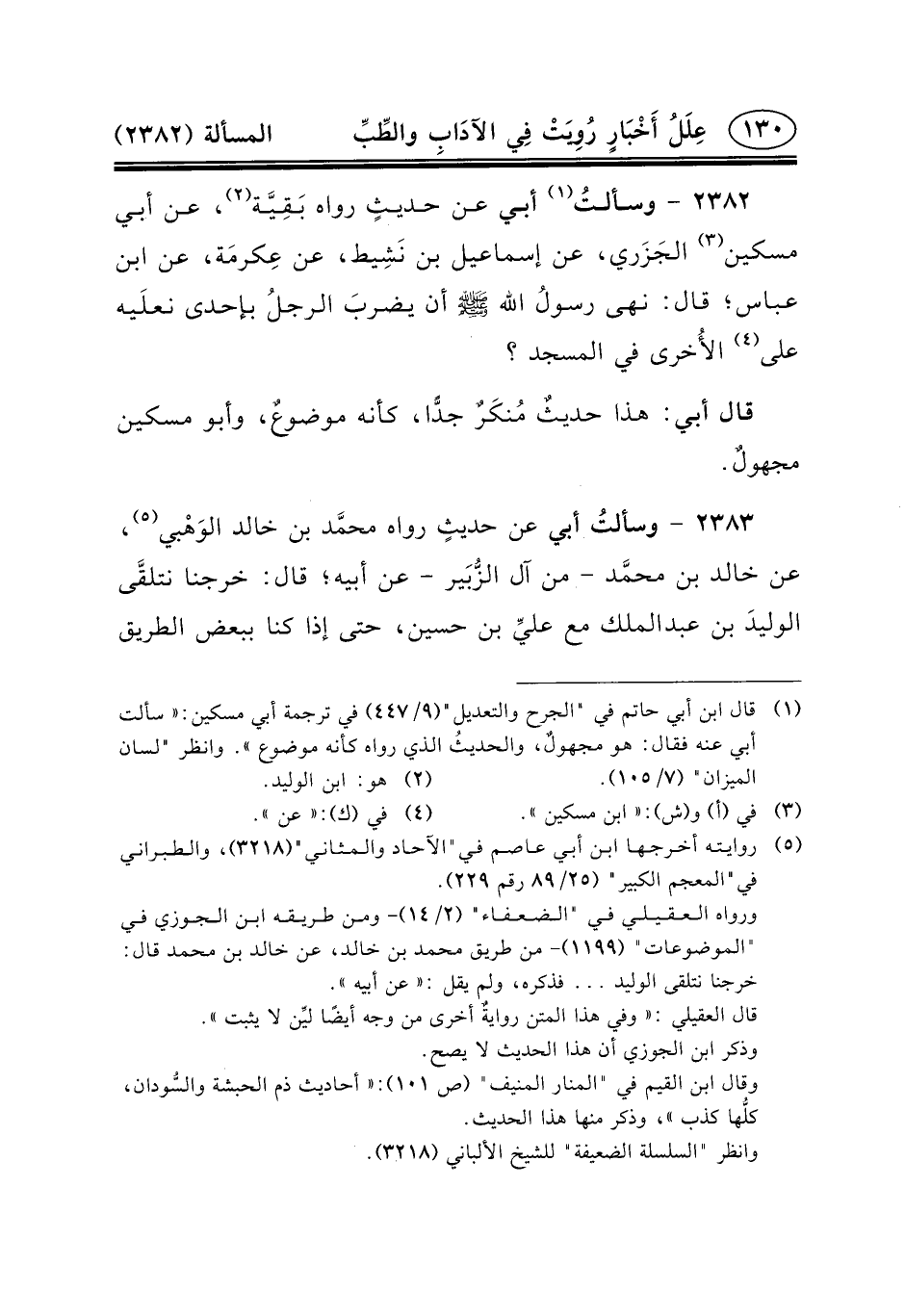 ٢٣٨٢ - وسألتُ (١) أَبِي عَنْ حديثٍ رَوَاهُ بَقِيَّة (٢) ، عَنْ أَبِي مِسْكِينٍ (٣) الجَزَري، عَنْ إِسْمَاعِيلَ بْنِ نَشِيط، عَنْ عِكرمَة، عَنِ ابْنِ عَبَّاسٍ؛ قَالَ: نهى رسولُ الله (ص) أَنْ يضربَ الرجلُ بِإِحْدَى نعلَيه عَلَى (٤) الأُخرى فِي الْمَسْجِدِ؟