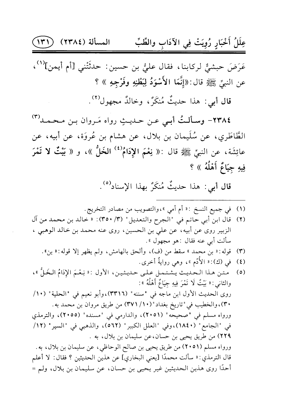 ٢٣٨٤- وسألتُ أَبِي عَنْ حديثٍ رَوَاهُ مَروان بْنُ مُحَمَّدٍ (٣) الطَّاطَري، عَنْ سُلَيمان بْنِ بِلالٍ، عَنْ هِشَامِ بْنِ عُروَة، عَنْ أَبِيهِ، عَنْ عائِشَة، عَنِ النبيِّ (ص) قال: نِعْمَ الإِدَامُ (٤) الخَلُّ، وبَيْتٌ لا تَمْرَ فِيهِ جِيَاعٌ أَهْلُهُ؟