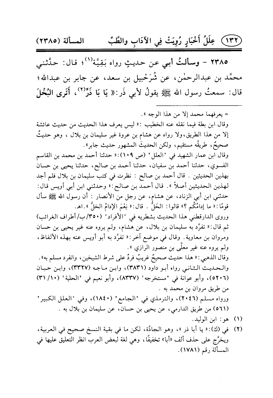 ٢٣٨٥ - وسألتُ أَبِي عَنْ حديثٍ رَوَاهُ بَقِيَّة (١) ؛ قَالَ: حدَّثني محمَّد بْنُ عبد الرحمن، عَنْ شُرَحْبيل بْنِ سَعْدٍ، عَنِ جابر بن عبد الله؛ قال: سمعتُ رسول الله (ص) يقولُ لأبي ذَر: يَا بَا ذَرٍّ (٢) ، أَتَرى البُخْلَ