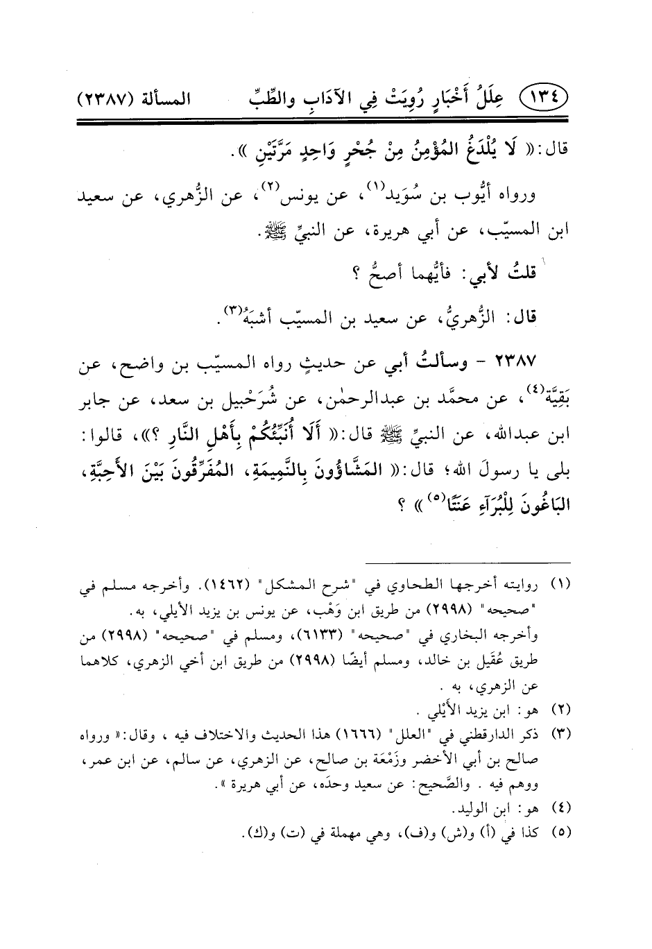 ٢٣٨٧ - وسألتُ أَبِي عَنْ حديثٍ رَوَاهُ الْمُسَيَّبُ بْنُ وَاضِحٍ، عَنْ بَقِيَّة (٤) ، عن محمَّد ابن عبد الرحمن، عَنْ شُرَحْبيل بْنِ سَعْدٍ، عَنِ جابر بن عبد الله، عن النبيِّ (ص) قَالَ: أَلَا أُنَبِّئُكُمْ بِأَهْلِ النَّارِ؟ ، قَالُوا: بَلَى يَا رسولَ اللَّهِ؛ قال: المَشَّاؤُونَ بِالنَّمِيمَةِ، المُفَرِّقُونَ بَيْنَ الأَحِبَّةِ، البَاغُونَ لِلْبُرَآءِ عَنَتًا (٥) ؟