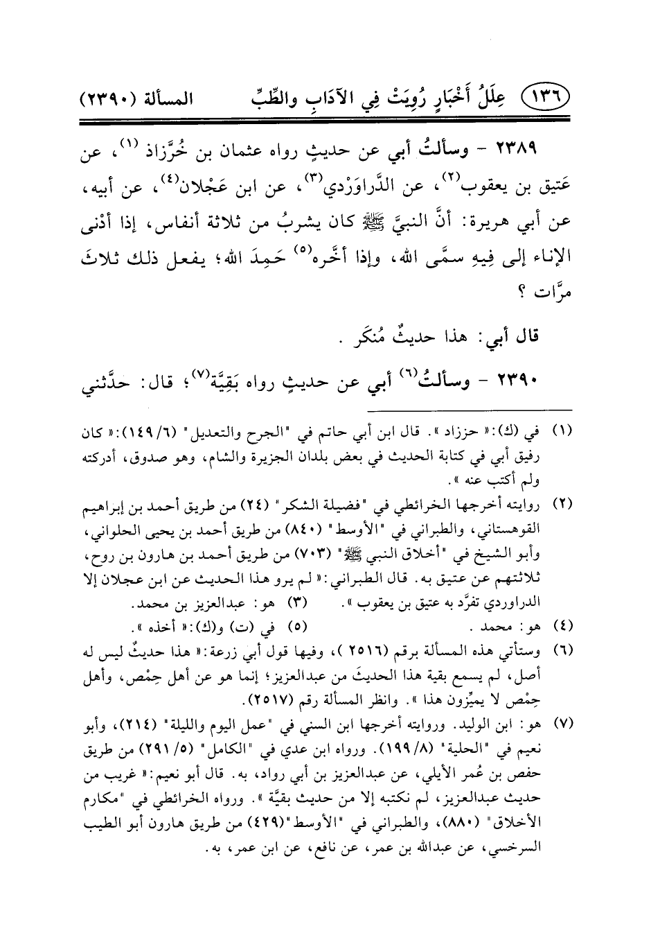 ٢٣٨٩- وسألتُ أَبِي عَنْ حديثٍ رَوَاهُ عثمان ابن خُرَّزاذ (١) ، عَنْ عَتيق بْنِ يَعْقُوبَ (٢) ، عَنِ الدَّراوَرْدي (٣) ، عَنِ ابْنِ عَجْلان (٤) ، عَنْ أَبِيهِ، عَنْ أَبِي هُرَيْرَةَ: أنَّ النبيَّ (ص) كَانَ يشربُ مِنَ ثَلاثَةِ أَنْفَاسٍ، إِذَا أدْنى الإِنَاءَ إِلَى فِيهِ سمَّى الله، وإذا أخَّره (٥) حَمِدَ اللَّهَ؛ يَفْعَلُ ذَلِكَ ثلاثَ مرَّات؟
