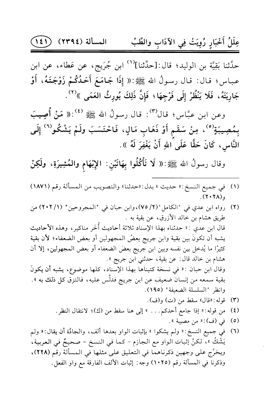 حدَّثنا بَقِيَّة بْنُ الْوَلِيدِ؛ قَالَ: [حدَّثنا] (١) ابْنُ جُرَيج، عَنْ عَطاء، عَنِ ابْنِ عَبَّاسٍ؛ قَالَ: قَالَ رسولُ الله (ص) : إِذَا جَامَعَ أَحَدُكُمْ زَوْجَتَهُ، أَوْ جَارِيَتَهُ، فَلَا يَنْظُرْ إِلَى فَرْجِهَا؛ فَإِنَّ ذَلِكَ يُورِثُ العَمَى (٢) .