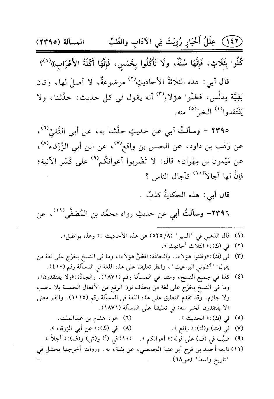 ٢٣٩٥ - وسألتُ أَبِي عَنْ حديثٍ حدَّثنا بِهِ، عَنْ أَبِي التَّقيِّ (٦) ، عَنْ وَهْب بْنِ داود، عن الحسن بن واقع (٧) ، عَنِ ابْنِ أَبِي الزَّرْقاء (٨) ، عَنْ مَيْمون بْنِ مِهْران؛ قَالَ: لا تَضْربوا أعوانكُم (٩) عَلَى كَسْر الآنِيَةِ؛ فإنَّ لَهَا آجَالا (١٠) كَآجَالِ النَّاسِ؟