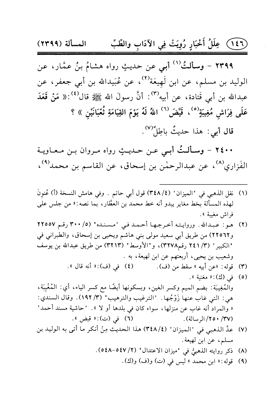 ٢٣٩٩- وسألتُ (١) أَبِي عَنْ حديثٍ رَوَاهُ هشامُ بنُ عمَّار، عَنِ الْوَلِيدِ بْنِ مُسْلِمٍ، عَنِ ابْنِ لَهِيعَة (٢) ، عن عُبَيدالله بن أبي جعفر، عن عبد الله بْنِ أَبِي قَتادة، عَنْ أَبِيهِ (٣) : أنَّ رسولَ الله (ص) قَالَ (٤) : مَنْ قَعَدَ عَلَى فِرَاشِ مُغِيبَةٍ (٥) ، قَيَّضَ (٦) اللهُ لَهُ يَوْمَ القِيَامَةِ ثُعْبَانَيْنِ؟