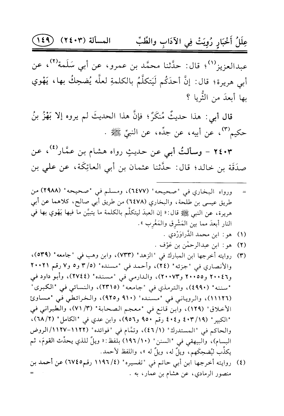 عبد العزيز (١) ؛ قَالَ: حدَّثنا محمَّد بْنُ عَمْرٍو، عَنْ أَبِي سَلَمة (٢) ، عَنْ أَبِي هُرَيْرَةَ؛ قَالَ: إنَّ أحدَكُم لَيَتكلَّمُ بالكلمةِ لعلَّه يُضحِكُ بِهَا، يَهْوي بِهَا أبعدَ مِنَ الثُّريا؟