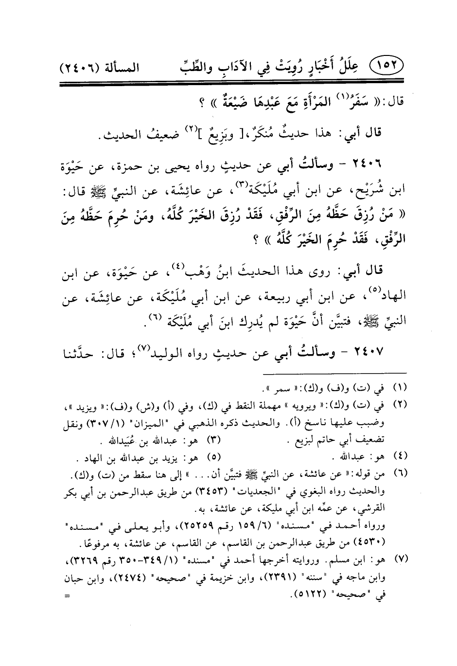 ٢٤٠٦ - وسألتُ أَبِي عَنْ حديثٍ رَوَاهُ يَحْيَى بْنُ حَمْزَةَ، عَنْ حَيْوَة بْنِ شُرَيْح، عَنِ ابْنِ أَبِي مُلَيْكَة (٣) ، عن عائِشَة، عن النبيِّ (ص) قَالَ: مَنْ رُزِقَ حَظَّهُ مِنَ الرِّفْقِ، فَقَدْ رُزِقَ الخَيْرَ كُلَّهُ، ومَنْ حُرِمَ حَظَّهُ مِنَ الرِّفْقِ، فَقَدْ حُرِمَ الخَيْرَ كُلَّهُ؟