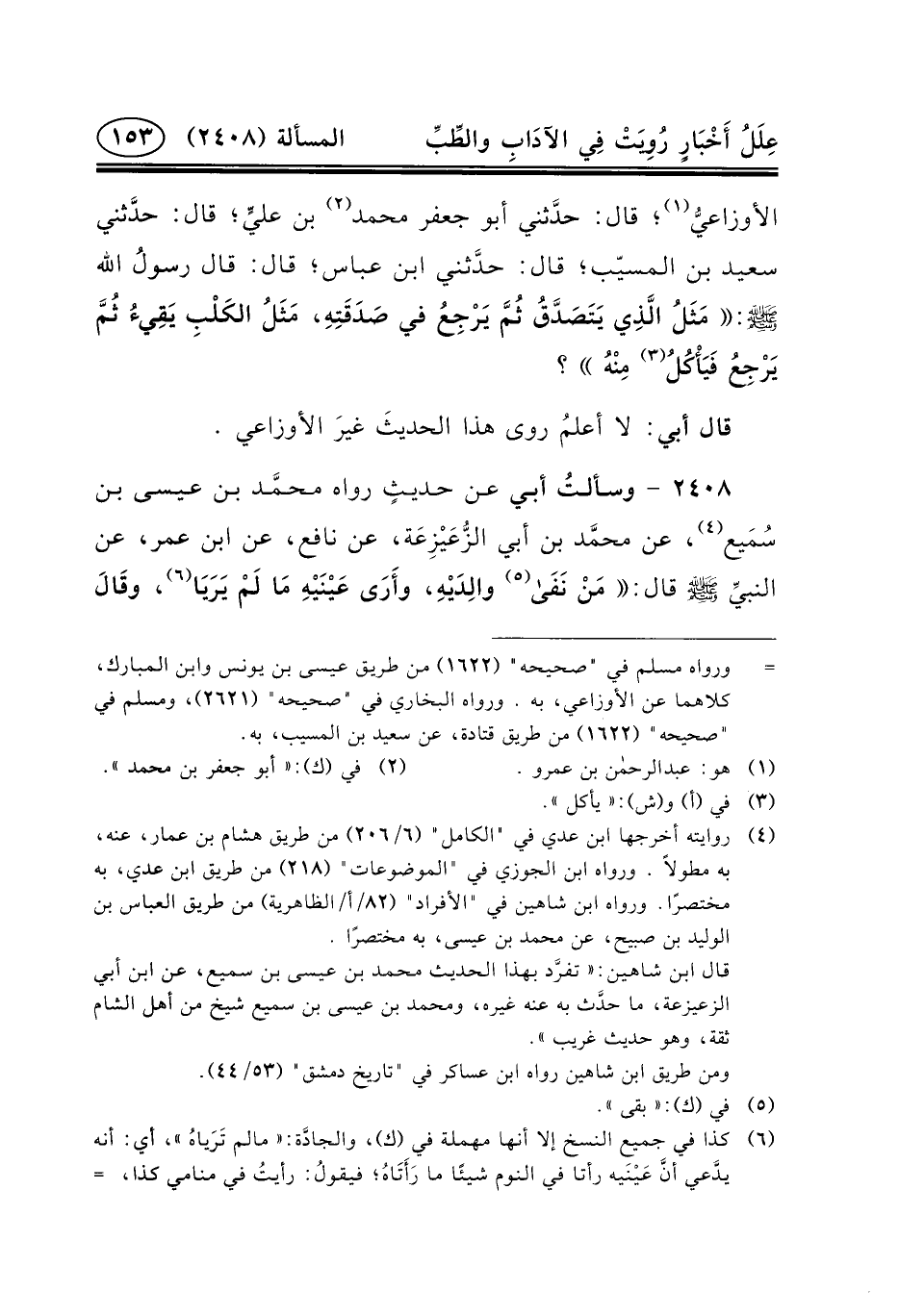 الأوزاعيُّ (١) ؛ قَالَ: حدَّثني أَبُو جَعْفَرٍ مُحَمَّدُ (٢) بْنُ عليٍّ؛ قَالَ: حدَّثني سَعِيدِ بْنِ الْمُسَيِّبِ؛ قَالَ: حدَّثني ابْنِ عَبَّاسٍ؛ قَالَ: قَالَ رسولُ الله (ص) : مَثَلُ الَّذِي يَتَصَدَّقُ ثُمَّ يَرْجِعُ فِي صَدَقَتِهِ، مَثَلُ الكَلْبِ يَقِيءُ ثُمَّ يَرْجِعُ فَيَأْكُلُ (٣) مِنْهُ؟
