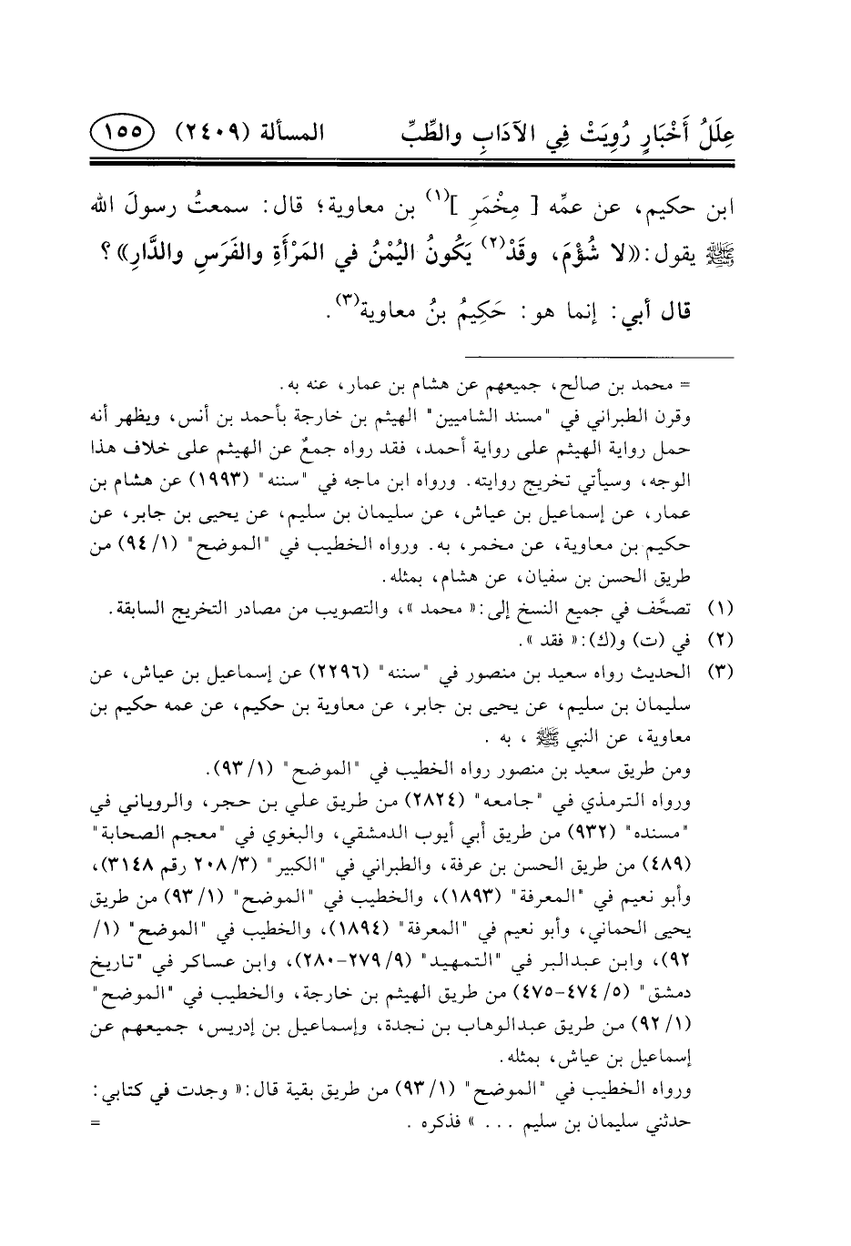 (٣) الحديث رواه سعيد بن منصور في "سننه" (٢٢٩٦) = = عَنْ إِسْمَاعِيلَ بْنِ عَيَّاشٍ، عَنْ سليمان بن سليم، عَنْ يَحْيَى بْن جَابِر، عَنِ مُعَاوِيَةَ بْنِ حَكِيمٍ، عَنْ عَمِّهِ حكيم ابن معاوية، عن النبي (ص) ، به.