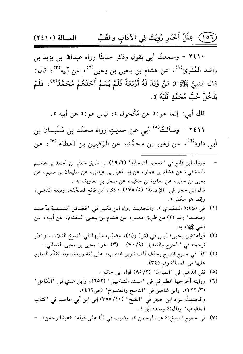٢٤١٠- وسمعتُ أَبِي يَقُولُ وَذَكَرَ حَدِيثًا رواه عبد الله بْنُ يَزِيدَ بْنِ رَاشِدٍ المُقرئ (١) ، عن هشام ابن يحيى بْنِ يَحْيَى (٢) ، عَنْ أَبِيهِ (٣) ؛ قَالَ: قال النبيُّ (ص) : مَنْ وُلِدَ لَهُ أَرْبَعَةٌ فَلَمْ يُسَمِّ أَحَدَهُمْ مُحَمَّدً (٤) ، فَلَمْ يَدْخُلْ حُبُّ مُحَمَّدٍ قَلْبَهُ.
